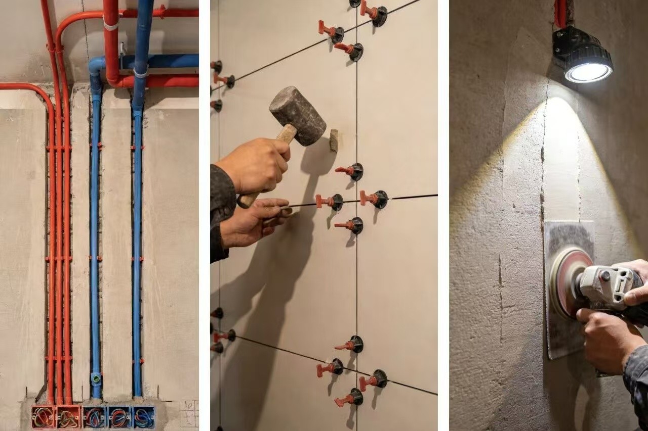 施工过程中,我们坚持“工艺看得见,品质摸得着”。水电改造是装修的“隐蔽工程”,也是重中之重。我们采用横平竖直的布线标准,强弱电分槽隔离,水管打压测试远超行业规范,从源头杜绝漏水、短路的隐患;墙面处理遵循“批刮、打磨、底漆、面漆”的严谨流程,不放过任何一处微小的瑕疵;木工、瓦工、油工各司其职,每一道工序都需要经过业主与项目管家的双重验收,才能进入下一个环节。