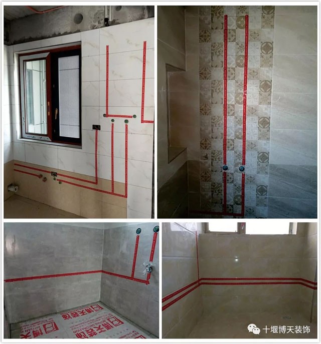 瓷砖铺贴平整美观,倒角处理看出师傅手艺非常好,嵌缝处理后整个瓷砖表面更光滑干净,标识带指示水管走向,方便后期主材安装。